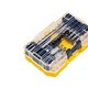 Modular, stackable small tough case. Designed for secure storage of accessories. Clear lid for easy identification. Easy bit removal and replacement. Bits securely lock into place. Use the locking system to connect the cases together, and securely stack on top of the medium Toughcase. Or, place into the accessory caddy for TSTAK compatible connection.