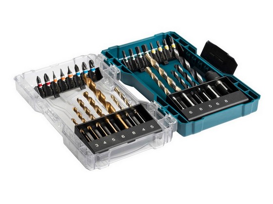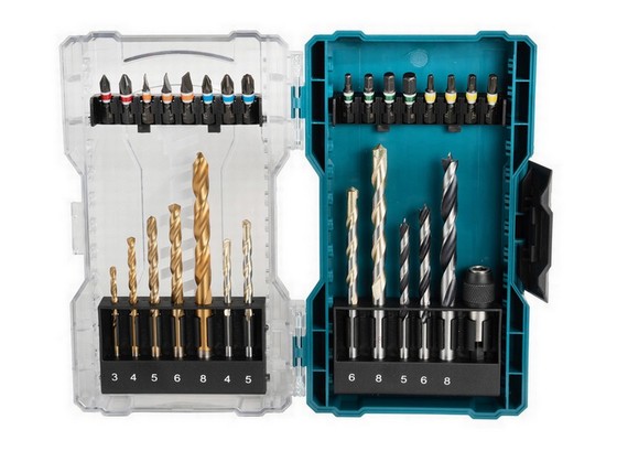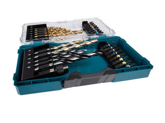 Drill and screw bit set for working with metal, wood and concrete. The set contains 5 HSS-Tin drill bits for metal, 3 brad point drill bits for wood, 4 drill bits for masonry, 16 screw bits and a bit holder. Total of 29 pieces in a plastic case.