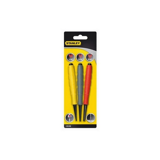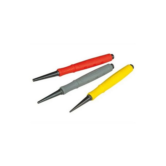 Stanley Dynagrip Nail Punch 3 piece set featuring tempered steel and long bevelled point. Colour coded for easy identification.