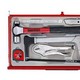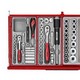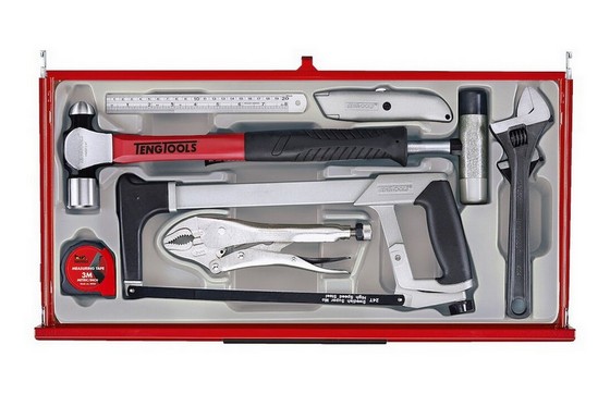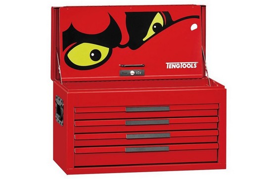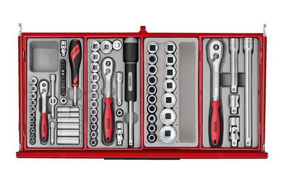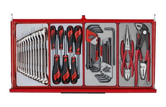 The TengTools 26" PRO35™ tool kit TKT26R137T in red is a mobile tool chest with 137 pieces. This compact and versatile tool kit is specially designed for professional users. The tool chest has four fully extendable drawers. Three of the drawers are 50 mm high, and one drawer is 75 mm high. Each drawer has a load capacity of 30 kg and is equipped with smooth-running ball-bearing slides. To protect both the tools and the drawers, they are fitted with noise-reducing EVA mats. The tool chest is 660 mm wide, 305 mm deep, and 380 mm high. It has a 3-piece chassis and is made of heavy-gauge steel treated with a phosphate-free 5-step rust protection process for long-lasting durability and corrosion resistance. Additionally, it is easy to assemble. This starter kit includes a variety of essential tools: 1/4", 3/8", and 1/2" drive sockets and ratchets, combination spanners, screwdrivers, hex & tx keys, pliers, and a selection of general tools. The tool chest is equipped with a 3-digit combination lock, making it harder for unauthorized persons to access the contents. The tool chest has recessed side handles, making it easy to move, and stable rubber feet that minimise damage to the surface. The fold-down front with the TengTools logo gives a unique appearance and protects the drawers when folded down. TKT26R137T is fully compatible with the TengTools Tool Control System, promoting efficient tool management and quick identification of missing or misplaced tools.
