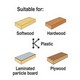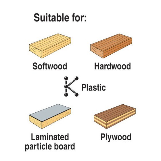 - Clean down-cutting of hardwood, plywood, laminated particle board, kitchen worktops and plastics.