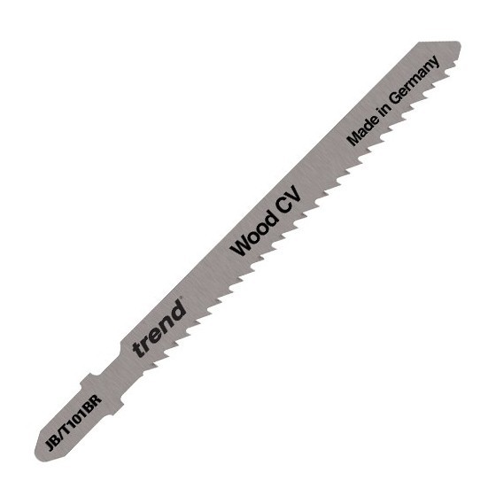Pack of 5 Trend jigsaw blades, ideal for clean down-cutting of hardwood, plywood, laminated particle board, kitchen worktops and plastics.