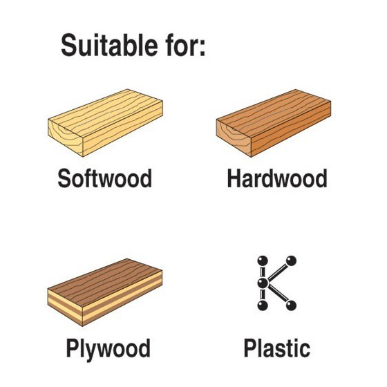 - Fast coarse cuts in hardwood, softwood, MDF, multiple glued wood and plastics.